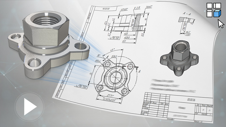 Видео демонстрирует создание чертежа по 3D модели с помощью 2D проекций. Показано создание простой проекции, разреза, нанесение размеров, шероховатостей, допусков, основной надписи.