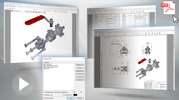 Видео демонстрирует экспорт документа, содержащего чертежи, спецификации, 3D модель и анимацию разборки в единый PDF документ.