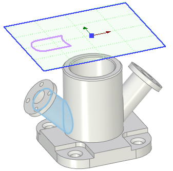 Например, построим проекцию очерка наклонной цилиндрической грани патрубка на горизонтальную рабочую плоскость. Для этого сначала делаем рабочую плоскость активной. Затем вызываем из ленты команду Проекция элементов и выбираем в окне параметров режим Проекция линий очерка элементов на рабочую плоскость. Далее выбираем нужную грань в 3D окне.