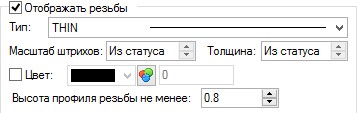 Если для проекции заданы маленькая толщина линий или крупный масштаб, то для отображения реального размера между линией проекции грани и линией, обозначающей резьбу, можно использовать параметр проекции "Высота профиля резьбы не менее" (закладка "Линии"). По умолчанию этот размер ограничен значением 0.8.