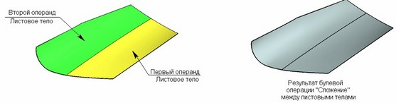 Если в качестве первого операнда было выбрано твёрдое тело, а в качестве второго – листовое, то в результате выполнения операции "Сложение" по умолчанию создается твёрдое тело. Грани листового тела будут формировать дополнительный объем для твердого тела.