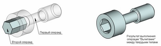 Результатом выполнения булевой операции "Вычитание" одного твёрдого тела из другого будет тело, переставляющее собой первый операнд, из которого удаляется объём второго операнда.