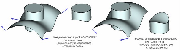 В результате выполнения булевой операции "Пересечение" листового тела, интерпретированного как полупространство, и твёрдого тела останется часть твёрдого тела, отсечённая листовым телом. Результат выполнения этой операции похож на результат выполнения булевой операции "Вычитания" листового тела (полупространства) из твёрдого тела. Отличие в том, что в результате выполнения операции "Пересечение" остаётся другая часть твёрдого тела. При этом порядок выбора операндов не влияет на результат.