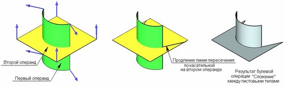 Следует отметить, что для формирования такого рода булевой операции необходимо, чтобы листовое тело при сложении с твёрдым телом замыкало объём. В противном случае невозможно получить результат операции.