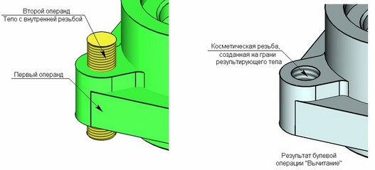 Если на грани одного из операндов нанесена косметическая резьба и эта грань контактирует с гранями другого операнда, то в этом случае есть возможность автоматически создать косметическую резьбу на грани результирующего тела. Например, как показано на рисунке ниже, из тела корпуса вычитается тело с косметической резьбой на грани. При этом на созданной грани результирующего тела автоматически создается косметическая резьба.