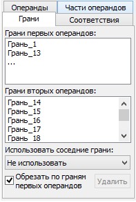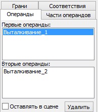 При помощи этих опций можно выбрать элементы, определяющие части операндов. Имена выбранных элементов будут добавлены в список на закладке "Части операндов" в окне "Свойства". На этой же закладке можно выбрать действие для выбранных частей операндов: оставлять их в результирующем теле или исключать. Это действие устанавливается для всех выбранных частей операндов.