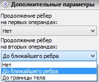 Если в команде в качестве операндов используются листовые тела, определённые как полупространства, то в этом случае для формирования результата булевой операции может возникнуть необходимость продолжения ребер пересечения операндов. Для этого нужно выбрать тип объекта, до которого продлевать рёбра первого или второго операнда. Это можно сделать при помощи соответствующих дополнительных параметров.