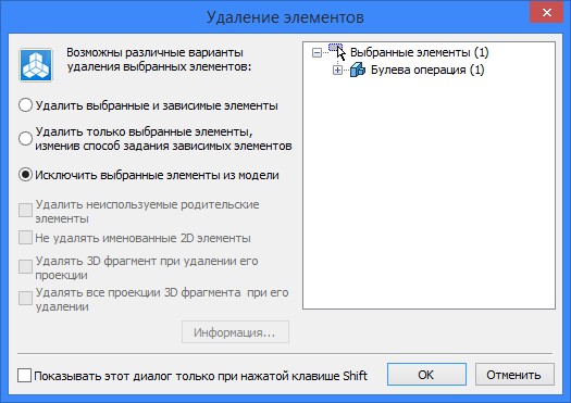 Если булева операция находится на верхнем уровне дерева, то при её удалении в дереве модели останутся Тела операндов этой булевой операции. Если же у булевой операции есть потомки, то при её удалении будет выдан диалог "Удаление элементов".