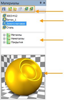 Список библиотек материалов представляет собой архив с часто используемыми при проектировании основными материалами и материалами покрытий, отсортированными по категориям. По умолчанию в программе открыты три библиотеки: Металлы, Неметаллы и Покрытия. Они обозначаются иконками