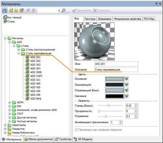 При необходимости можно создавать новые материалы прямо в дереве 3D модели, вызвав команду контекстного меню “Создать материал”. После вызова команды на экране появляется диалог «Свойства материала».