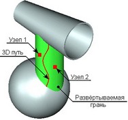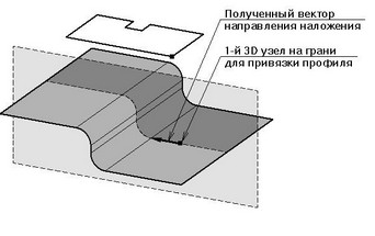 На рисунке справа показан вариант, когда первый выбранный на поверхности 3D узел принадлежит крайней грани. В этом случае вектор направления наложения определяется автоматически.