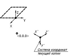 Каждый вектор, задающий направление оси системы координат копии определяется двумя точками. Первая точка имеет координаты <0.0.0>. Координаты вторых точек векторов, направляющих оси системы координат текущей копии, определяются параметрами X,Y,Z из соответствующей группы управляющих параметров.