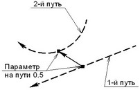 ●По минимальному расстоянию между путями в точке начала координат. Из точки начала системы координат копии на первом пути строится вектор к ближайшей точке на втором пути. |