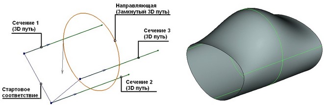 Вместо направляющих может быть использован один 3D путь, являющийся аналогом множества направляющих, проходящих через все точки сечений. Путь задаёт граничные условия для всей результирующей поверхности. Поэтому при задании направляющего пути другие граничные условия не задаются. Единственным исключением является возможность указать касательное направление к создаваемой поверхности по тому же пути в точке его пересечения с сечением, заданным 3D профилем (см. ниже). Данный путь не обязан иметь пересечения с сечениями. На приведенном ниже рисунке первая операция создана без использования пути и направляющих, вторая – с использованием 3D пути.