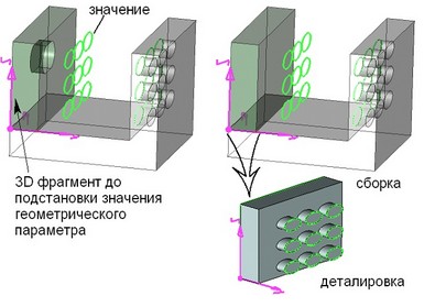 Для использования 3D фрагмента как адаптивного элемента модели необходимо заранее определить набор геометрических параметров, которые могут быть связаны с объектами сборочной модели. Как и набор внешних переменных, набор геометрических параметров задаётся в документе 3D фрагмента. Система допускает задание геометрических параметров и их значений непосредственно при вставке или при редактировании 3D фрагмента, но в этом случае созданные связи будут использоваться только в текущей сборочной модели. В этом случае в документе 3D фрагмента эта информация не сохраняется. При вставке адаптивного 3D фрагмента пользователь указывает значения геометрических параметров. Тип объекта-значения должен совпадать с типом объекта, который является параметром 3D фрагмента. Например, значение для 3D профиля может задаваться только 3D профилем.