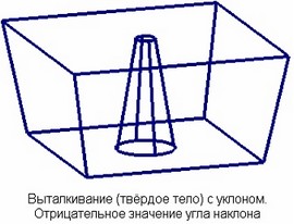 При создании выталкивания возможно автоматическое создание уклона боковых граней. Все боковые грани создаваемого тела отклоняются от своего исходного положения на заданный угол.