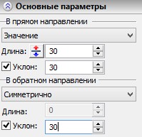 Значение уклона указывается в окне свойств. В случае задания длины выталкивания произвольным числовым значением или по длине вектора направления отдельно указываются значения уклонов для выталкиваний в прямом и обратном направлении. Для задания уклона в любом направлении выталкивания необходимо в соответствующей группе параметров ("В прямом направлении", "В обратном направлении") установить флажок "Уклон". После этого станет доступно для редактирования поле для ввода числового значения уклона.
