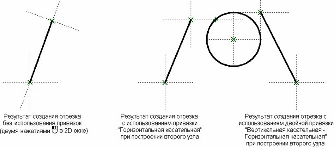 Допустим, при задании второго узла отрезка была использована горизонтальная привязка относительно другого узла. В результате узел будет создан не так, как описано выше, а на пересечении горизонтальной прямой, проходящей через узел привязки, и прямой, ей перпендикулярной. Если же в той же ситуации использовать двойную привязку к окружности "Вертикальная касательная-Горизонтальная касательная", то узел отрезка будет создан на пересечении прямых, являющихся горизонтальной и вертикальной касательными к указанной окружности.