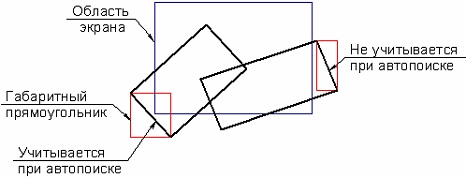 Только на видимой части чертежа. Если флаг установлен, то при поиске контура штриховки система анализирует только те линии изображения, габаритный прямоугольник которых пересекается с границами рабочего окна чертежа. Этот режим позволяет сократить время поиска при достаточно насыщенном чертеже. Под габаритным прямоугольником линии понимается прямоугольная область, целиком охватывающая её. Примеры определения габаритных прямоугольников линий приведены на рисунках ниже.