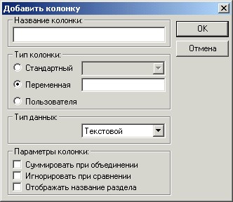 Также при создании колонки устанавливаются перечисленные выше параметры (Суммировать при объединении. Игнорировать при сравнении. Отображать название раздела.).