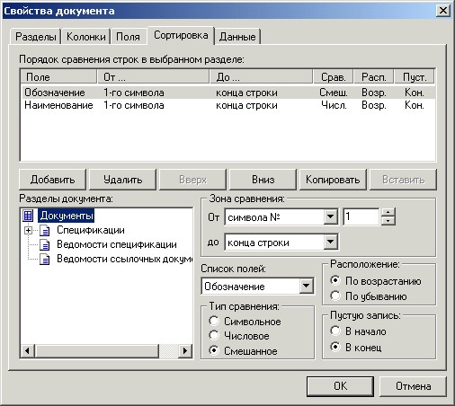 Сортировка, заданная для раздела "Документы", предназначена для записей, не относящихся к какому-либо разделу спецификации. Если правила сортировки для раздела не заданы, то записи в таблице будут расположены в порядке их занесения в базу данных.