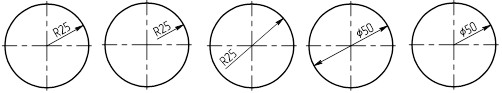 После того, как выбраны необходимые установки, на чертеже появится проставленный размер. Вот некоторые типы размеров на окружности, которые можно проставить в системе.