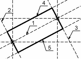 Создайте две точки привязки будущего фрагмента. После этого необходимо построить линию построения 1, проходящую через два узла – точки привязки. Данная прямая будет задавать ось X новой локальной системы координат этого чертежа. Для создания оси Y локальной системы координат необходимо построить линию построения 2, проходящую через узел и перпендикулярную линии построения 1. Линия, построенная через два узла, и линия, перпендикулярная ей, определяют новую локальную систему координат чертежа. Все последующие построения необходимо вести относительно линий, определяющих новую систему координат чертежа. Создайте линию 3, параллельную линии 2 и проходящую через узел, определяющий вторую точку привязки. Затем постройте линии 4 и 5, параллельные линии 1. После этого можно создать необходимые линии изображения.