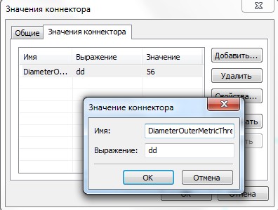 В поле "Выражение" могут быть подставлены число (или текст в кавычках для текстовой переменной), выражение или имя переменной текущего документа. В нашем примере нужно передавать в другие фрагменты значение диаметра, за который в модели вала отвечает определенная переменная (например, ‘D’). При создании именованного значения для коннектора можно задать имя ‘Diameter’, в поле для выражения поставить переменную ‘D’. При создании модели подшипника для переменной, отвечающей за посадочный диаметр, нужно задать в свойствах для неё новое значение коннектора с именем ‘Diameter’.