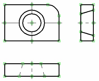 Для примера используем уже знакомый чертёж плиты с коническим отверстием. Начнем построения с главного вида плиты. Далее, используя объектные привязки, построим две проекции: "Вид слева" и "Вид сверху".