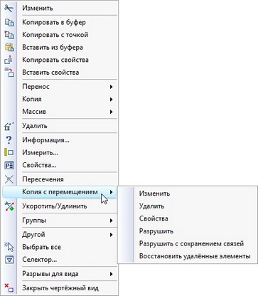 (<С>) в режиме активного чертёжного вида становятся доступны команды редактирования перемещения. Укажите курсором на одну из линий изображения и нажмите правую кнопку мыши. В появившемся меню будут расположены команды:
