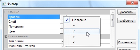Работа с фильтром состоит в задании одного или нескольких условий на параметры выбираемых объектов. Элементы, параметры которых не соответствуют ни одному из заданных в фильтре условий, будут недоступны для выбора, даже если их выбор разрешён настройками селектора.