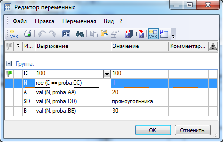 Рассмотрим связь переменных с внутренней БД на примере чертежа PROBA.