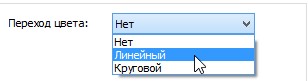 Тип заливки задаётся параметром "Переход цвета". Из выпадающего списка можно выбрать следующие варианты: