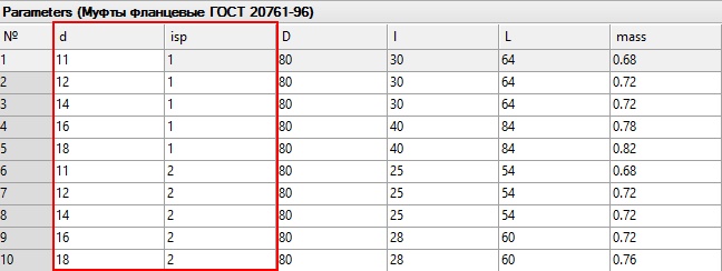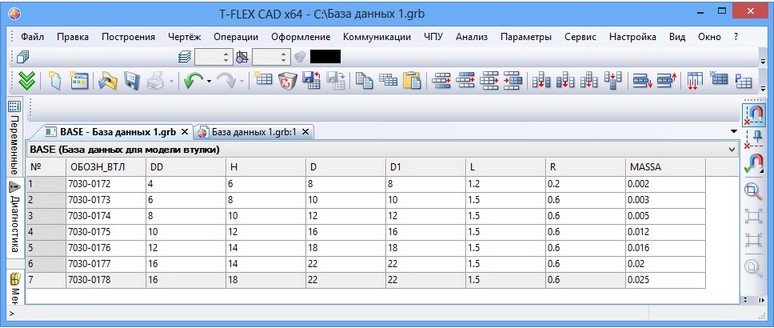 Таким образом, мы создали внутри чертежа базу данных, которая является аналогом таблицы из справочника. Теперь в редакторе переменных можно произвести отбор необходимых значений из этой таблицы, в зависимости от определяющего параметра (в нашем случае внутренний диаметр), для пересчёта модели и получить чертёж втулки нужного размера.