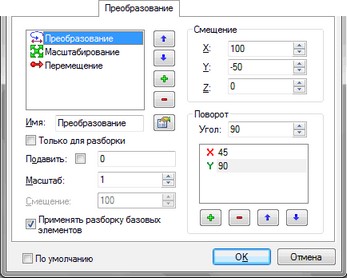 На данной закладке задаются параметры, позволяющие изменить положение операции (3D элемента построения) относительно её исходного положения. Положение объекта может быть задано набором преобразований, каждое из которых будет обладать параметрами, соответствующими его типу. Редактировать или создавать новые преобразования можно либо на закладке "Преобразование" параметров объекта, либо при помощи команды "3EG - Преобразование" (во втором случае все поля данной закладки отображаются в окне "Свойства"). Список преобразований отображается в окне, расположенном в левом верхнем углу. В остальных полях содержатся значения параметров текущего (выбранного в списке) преобразования. При создании тела (элемента построения) по умолчанию создаётся одно преобразование "Перемещение-поворот" с нулевыми значениями параметров. Исключение составляют 3D фрагменты, особенности преобразований которых будут рассмотрены ниже.