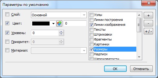 Имеется возможность задать полный набор параметров по умолчанию для конкретного вида элементов. Для этого необходимо вызвать команду создания элемента. Далее нужно сразу вызвать диалог «Параметры …» элемента и произвести нужные настройки. Важно помнить, что измененные параметры установятся по умолчанию для вновь создаваемых элементов данного типа в случае, если диалог «Параметры …» был вызван перед созданием нового элемента. В противном случае нужно будет для этого еще устанавливать флажок