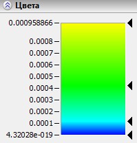 В зависимости от значения кривизны в точке, линии эпюры имеют разный цвет. Распределение цветов в пределах изменения величины измеряемого параметра настраивается на закладке «Цвета», расположенной в окне свойств. На закладке представлена цветовая шкала. Слева от шкалы показаны значения, которые соответствуют определённому цвету шкалы. Справа от шкалы можно увидеть черные треугольные маркеры, служащие для настройки шкалы. С каждым маркером соотносится какой-то цвет. Цвета на шкале плавно меняются от одного маркера к другому. Маркеры можно перемещать вдоль цветовой шкалы, для этого нужно «схватить» мышкой маркер и перетащить в новое место. Вместе с этим свой вид изменит цветовая шкала и, соответственно, изображение в 3D окне.
