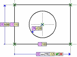 Параметрические отношения – Отношения для элементов построения, имеющих геометрические параметры, которые могут быть заданы переменными. К таким геометрическим параметрам относятся, например, смещение у прямой, параллельной другой прямой, угол прямой под углом к другой прямой или к горизонтали, радиус окружности и т.п. Исключением являются вертикальные и горизонтальные прямые, для которой видимость Отношений регулируется отдельным флажком (см. ниже).