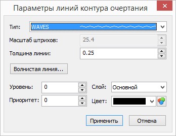 Свойства волнистой или ломаной линии. Для волнистой и ломаной линии можно установить такие параметры, как количество периодов, длина периода и высота волны. Размерность – единицы модели. Для ломаной линии нужно устанавливать такое значение периода, чтобы на линии разрыва была одна щепка. Размер щепки управляется амплитудой.