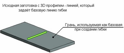 Особый вид отгибания – отгибание по профилю. Незамкнутый 3D профиль, созданный на грани заготовки, используется как шаблон для отгибаемого язычка. Базовая линия задаётся концами профиля.