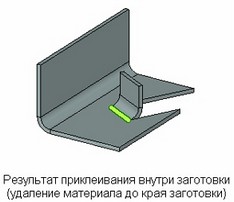 В большинстве случаев приклеивание язычка осуществляется к одному из боковых рёбер (это осуществляется выбором соответствующего ребра заготовки в качестве базовой линии при нулевом смещении от неё). Однако можно выполнить приклеивание и внутри заготовки. Например, когда в качестве базовой линии выбрано ребро 3D профиля, лежащего на грани заготовки или когда задано отрицательное смещение при приклеивании к боковому ребру. В этом случае материал заготовки, замещаемый приклеиваемым язычком, удаляется. Ширина удаляемой части, как и при отгибании, определяется перпендикулярами к базовой линии (с учётом отступов), проведёнными из её концов. При этом возможны два варианта удаления: либо удаляется весь материал до края заготовки, либо удаление производится только на длину приклеиваемого язычка.