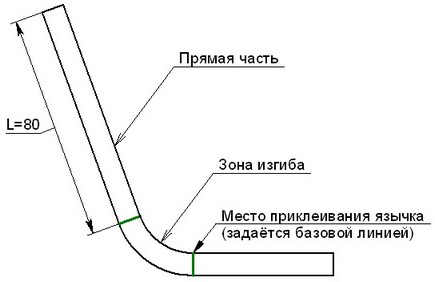 Длина приклеиваемого язычка может рассчитываться четырьмя способами: по нейтральному слою, по внешней стороне, по внутренней стороне или по прямой части приклеиваемого язычка. На следующих рисунках приведены результаты приклеивания язычка длиной L=80 мм при различных способах расчёта длины.
