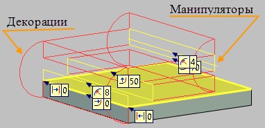 При создании гибки (после указания базовой линии) в окне 3D модели появляются вспомогательные графические объекты – манипуляторы и декорации. Они схематично показывают форму и размеры создаваемого сгиба. Кроме того, каждый из этих объектов имеет свою, чётко определённую функцию, – манипуляторы служат для изменения размеров гибки прямо в 3D сцене, а декорации извещают пользователя о возможности или невозможности создания гибки при заданных параметрах.
