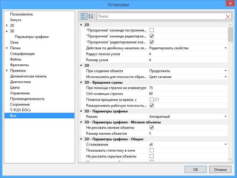 С помощью строки поиска можно найти нужный параметр, достаточно ввести её название или его часть.