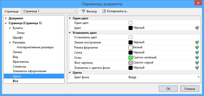 Следует отметить, что при установленном параметре “Один цвет” установка цветов для элементов с цветом фона, линий построения и узлов игнорируется.