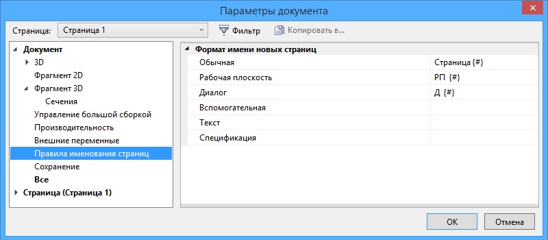 На закладке можно задать имена и порядковые номера для следующих типов страниц: Обычная, Рабочая плоскость, Диалог, Вспомогательная, Текст и Спецификация.