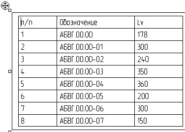 После нажатия кнопки [OK] на чертёж добавляется таблица. При желании её можно переместить при помощи маркера в левом верхнем углу.