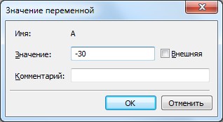 После этого в окне “Переменные” или в основном окне редактора переменных (вызывается командой “V: Редактировать переменные”) измените значение переменных "А" и "B".