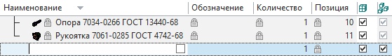 По умолчанию отображаются колонки: “Наименование”, “Обозначение”, “Количество”, “Позиция” и две колонки, отвечающие за включение записей в отчёты и при вставке в сборку. В дальнейшем можно вручную настроить отображение колонок в этом окне.