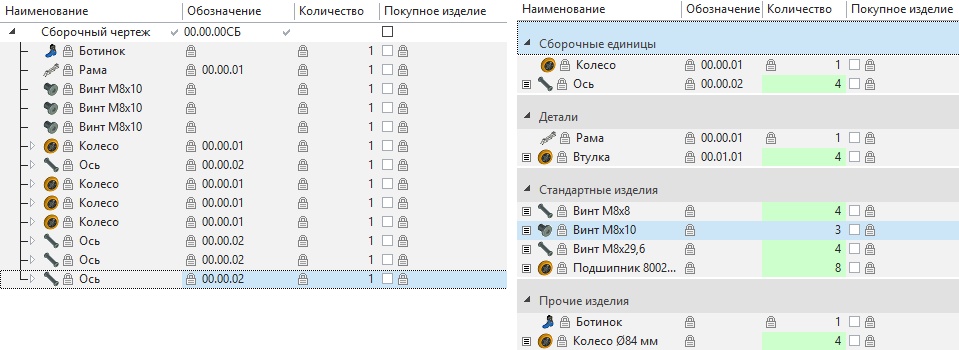 Колонки "Включать в отчёт" и "Включать в сборку" отображают флаги, включающие запись в отчёты текущего документа и включающие его в структуру изделия сборки следующего уровня.